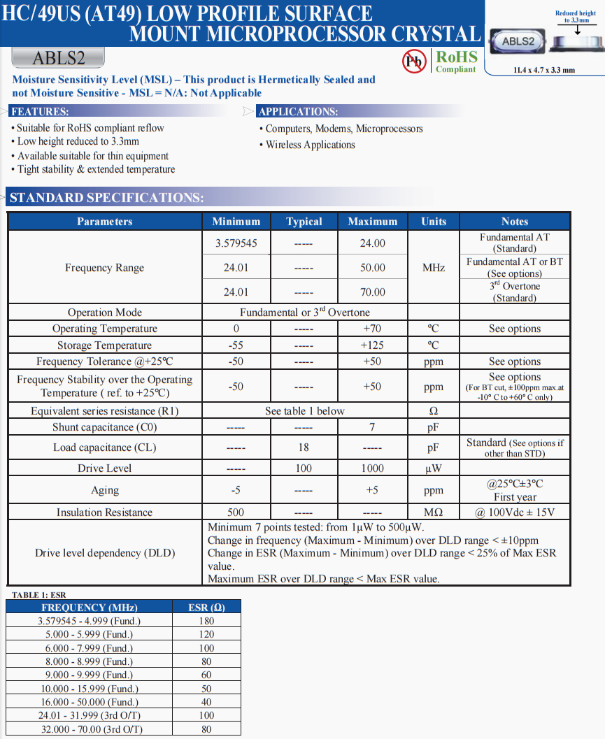 | ABLS2-29.4912MHZ-D4YF-T | Abracon | ABLS2 | 29.4912 MHz | ±30ppm | ±30ppm | 18 pF |