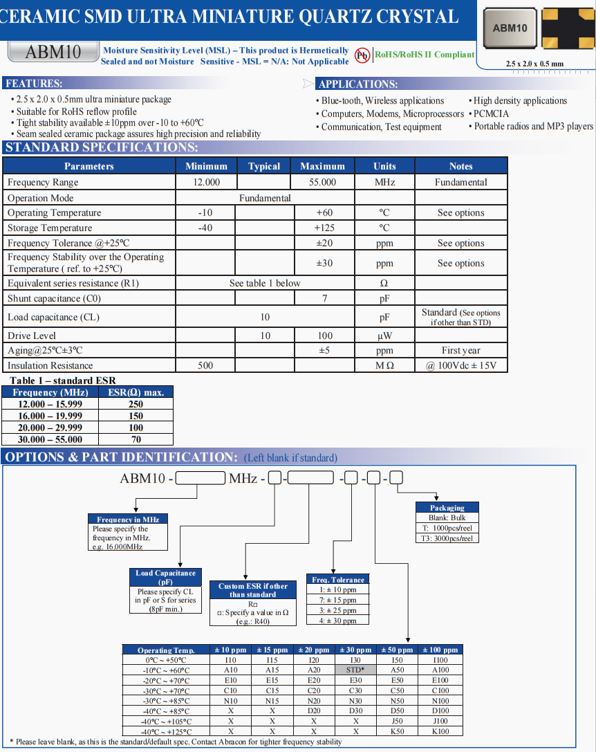 | ABM10-25.000MHZ-E20-T | Abracon | ABM10 | 25 MHz | ±20ppm | ±20ppm | 10 pF |