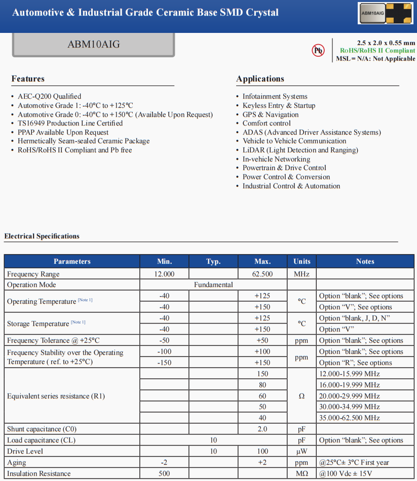 艾伯康歐美晶振,ABM10AIG-24.576MHZ-4-T3汽車多媒體晶振,ABM10AIG無鉛晶振,美國Abracon晶振公司,艾博康晶振,ABM10AIG晶振,ABM10AIG-24.576MHZ-4-T3晶振,進(jìn)口晶振,無源晶振,美國晶振,高品質(zhì)晶振,低損耗晶振,高精度晶振,2520晶振,四腳晶振,石英晶體,貼片晶振。適用于RoHS回流配置文件,AEC-Q200合格,汽車等級1:-40°C至+125°C,汽車等級0:-40°C至+150°C(可根據(jù)要求提供),TS16949生產(chǎn)線認(rèn)證,PPAP可根據(jù)要求提供,密封密封陶瓷封裝,符合RoHS/RoHS II標(biāo)準(zhǔn)且不含鉛,信息娛樂系統(tǒng),無鑰匙進(jìn)入和啟動,GPS和導(dǎo)航,舒適控制,ADAS(高級駕駛輔助系統(tǒng)),車對車通信,激光雷達(dá)(光探測和測距),車載網(wǎng)絡(luò),動力總成和驅(qū)動控制,電源控制和轉(zhuǎn)換,工業(yè)控制和自動化