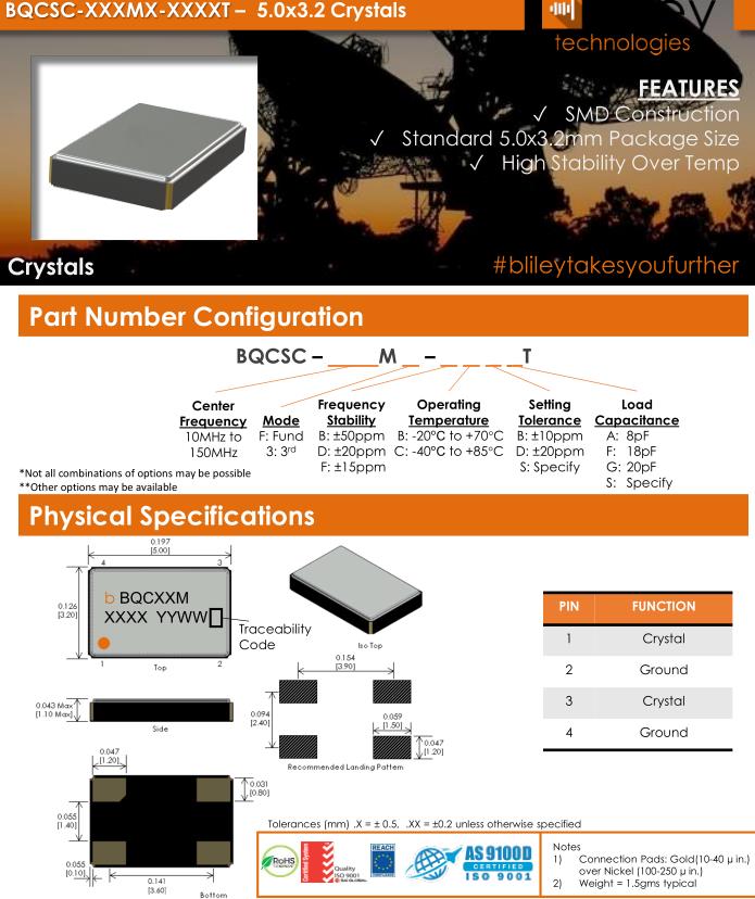 Bliley晶振,BQCSC晶振,BQCSC-24.000M-FDBBAT晶振,小型表面貼片晶振型,是標準的石英晶體振蕩器,適用于寬溫范圍的電子數碼產品,家電電器及MP3,MP4,播放器,單片機等領域.可對應8.000MHz以上的頻率,在電子數碼產品,以及家電相關電器領域里面發揮優良的電氣特性,滿足無鉛焊接的回流溫度曲線要求.Bliley Technologies Inc. 最初于 1930 年作為 Bliley Piezo-Electric Company 成立。最初,我們為業余無線電市場制造石英晶體。在 1930 年代中期,我們的客戶和產品很快擴大到與新興的軍事和商業通信領域的利益相匹配,我們的名稱更名為 Bliley Electric Company。1939 年,我們是最大的水晶公司,擁有 11 名員工。