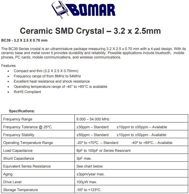 | Frequency Stability | ±50ppm – Standard ±10ppm to ±50ppm - Available |
