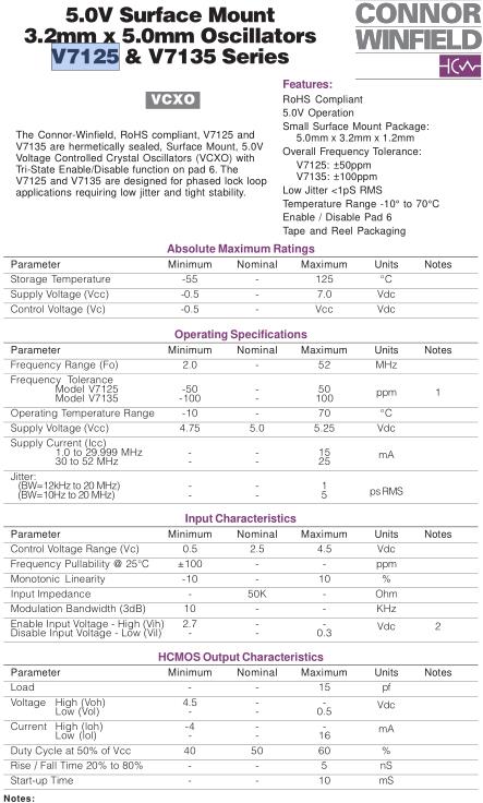 ConnorWinfield晶振,V7125晶振,V7125-020.0M晶振,5032mm體積的石英晶體振蕩器,有源晶振,該產品可驅動2.5V的溫補晶振,壓控晶振,VC-TCXO晶體振蕩器產品,電源電壓的低電耗型,編帶包裝方式,可對應自動高速貼片機自動焊接,及IR回流焊接(無鉛對應),為無鉛產品,超小型,質地輕.產品被廣泛應用到集成電路,程控交換系統,無線發射基站.
