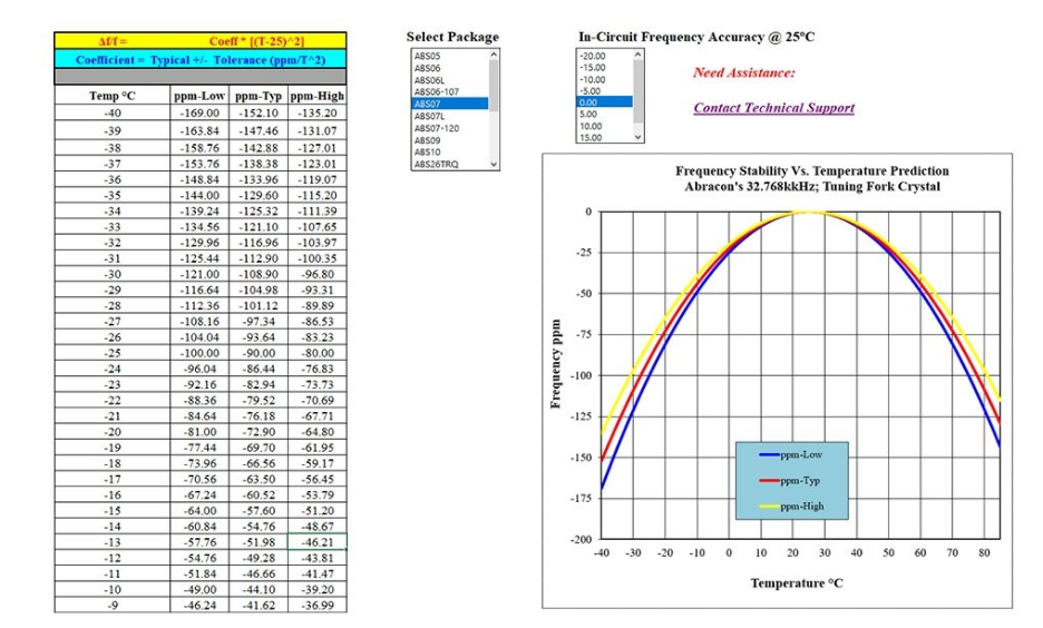 雖然可以使用數據表參數估算任何音叉晶體的溫度漂移頻率,但這種獨特的工具可快速估算給定晶體系列的最小,最大和典型漂移.易于使用,選擇晶體系列和所需的偏移是確定晶體中心頻率所必需的.