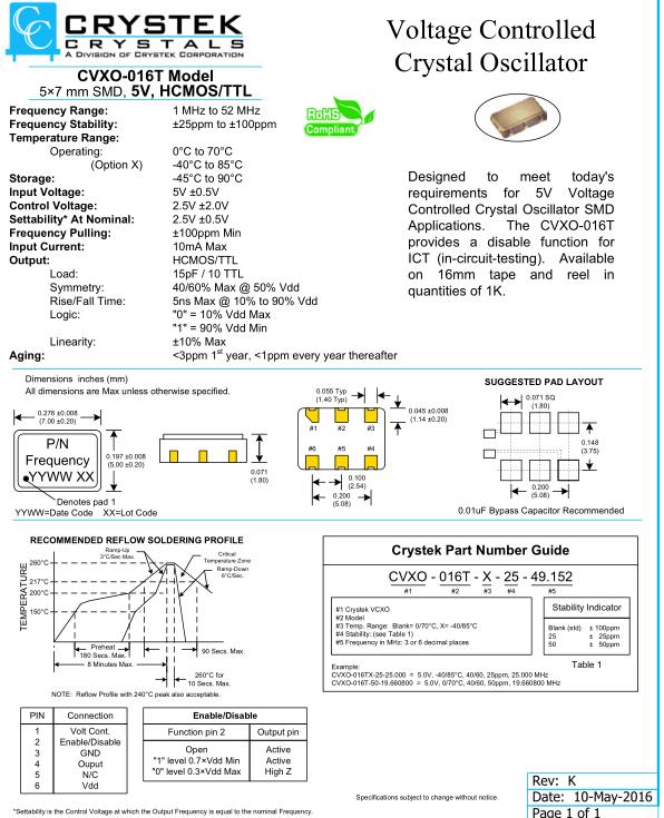 Crystek晶振,CVXO-016T晶振,CVXO-016T-X-25-49.152晶振,壓控晶振(VCXO),壓控石英晶體振蕩器基本解決方案,PECL輸出,輸出頻率60MHz到200MHz之間,出色的低相位噪聲和抖動,三態功能,應用:SDH/SONET,以太網,基站,筆記本晶振應用,符合RoHS/無鉛.