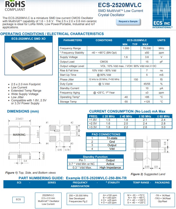ECS晶振ECS-2520MVLC緊湊型低電流MultiVolt表面貼裝振蕩器具有更寬的輸出頻率范圍,適合各種時鐘應用。
