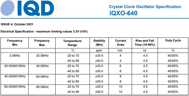 頻率參數:頻率3.0MHz至80.0MHz,頻率穩定性:30.00ppm至100.00ppm,25°C時最大老化率為5ppm年