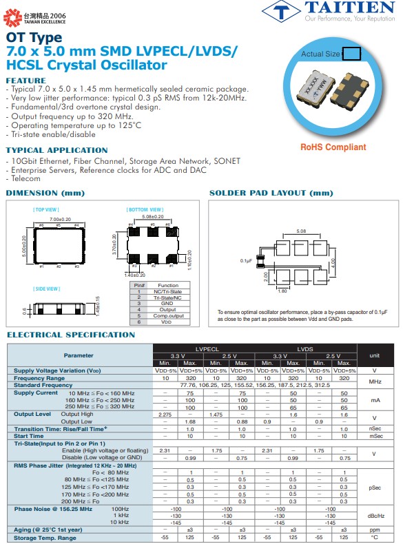 Taitien的OT-M和OW-M系列超低抖動(dòng)非常適合高速網(wǎng)絡(luò)應(yīng)用,OTETGCLTNF-156.250000,LVPECL差分晶振