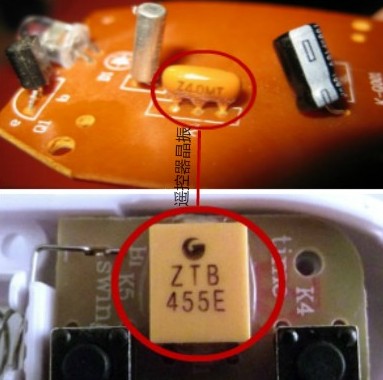 遙控器上的晶振采用CRB455E陶瓷諧振器,頻率455KHZ,諧振器頻率精度:455±2KHZ,諧振阻抗:20Ωmax,電容量:100PF±0.5%,諧振頻率溫度穩定性:±0.3%(-20℃—+80℃)max,耐電壓:50V DC max,輸入最大電壓:15Vp-p max,絕緣電阻:10MΩ(100V,DC)max