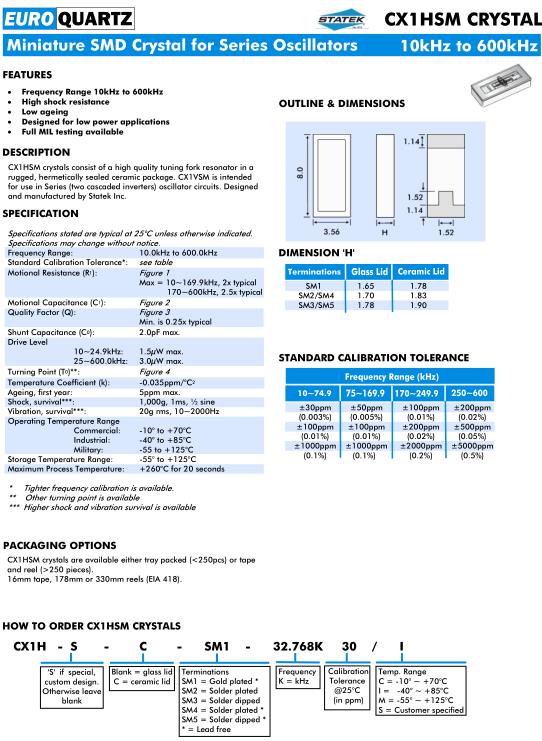 Euroquartz晶振,CX1HSM晶振,CX1H-S-C-SM1-32.768K30/I晶振