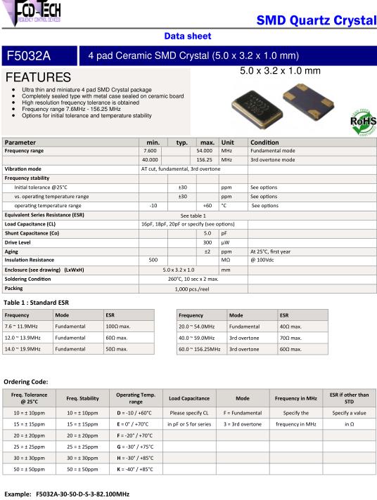 FCD-Tech晶振,F5032A晶振,F5032A-3050DS3-24.000MHz晶振,小型表面貼片晶振型,是標準的石英晶體振蕩器,適用于寬溫范圍的電子數碼產品,家電電器及MP3,MP4,播放器,單片機等領域.可對應8.000MHz以上的頻率,在電子數碼產品,以及家電相關電器領域里面發揮優良的電氣特性,滿足無鉛焊接的回流溫度曲線要求.FCD-Tech晶振電子元器件廠家重要經營的產品范圍有:石英晶體,晶體振蕩器,水晶過濾器,射頻和微波產品,壓電晶體傳感器這些大類產品,今天主要介紹壓電晶體傳感器這一系列元器件產品,使用石英晶體為監控測試設備進行高精度的測量,溫度,質量,同時為其提供高性能的準確導航定位