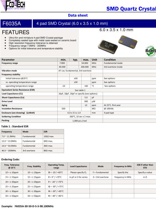 FCD-Tech晶振,F6035A晶振,F6035A-3050DS3-20.000MHz晶振,貼片晶振本身體積小,超薄型石英晶體振蕩器,特別適用于有目前高速發展的高端電子數碼產品,因為晶振本身小型化需求的市場領域,小型,薄型是對應陶瓷振蕩器(偏差大)和普通的石英晶體振蕩器(偏差小)的中間領域的一種性價比較出色的產品.產品廣泛用于筆記本電腦,無線電話,衛星導航SSD,USB,Blu-ray等用途,符合無鉛焊接的高溫回流焊曲線特性.