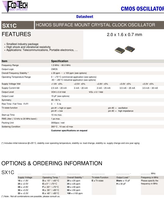 FCD-Tech晶振,SX1C晶振,SX1C-28F20EH-12.000MHz晶振,小型SMD有源晶振,從最初超大體積到現在的7050mm,6035mm,5032mm,3225mm,2520mm體積,有著翻天覆地的改變,體積的變小也使產品帶來了更高的穩定性能,接縫密封石英晶體振蕩器,精度高,覆蓋頻率范圍寬的特點,SMD高速自動安裝和高溫回流焊設計,Optionable待機輸出三態輸出功能,電源電壓范圍:1.8V~5V,高穩定性,低抖動,低功耗,主要應用領域:無線通訊,高端智能手機,平板筆記本WLAN,藍牙,數碼相機,DSL和其他IT產品的晶振應用,三態功能,PC和LCDM等高端數碼領域,符合RoHS/無鉛.
