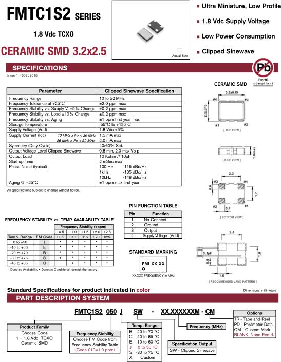 FMI晶振,FMTC1S2晶振,FMTC1S2050JSW-16.000M-CM晶振,溫補晶振(TCXO)產品本身具有溫度補償作用,高低溫度穩定性:頻率精度高0.5PPM-2.0PPM,工作溫度范圍:-30度至85度,電源電壓:1.8V-3.3V之間可供選擇,產品本身具有溫度電壓控制功能,世界上最薄的晶振封裝,頻率:26兆赫,33.6兆赫,38.4兆赫,40兆赫,因產品性能穩定,精度高等優勢,被廣泛應用到一些比較高端的數碼通訊產品領域,GPS全球定位系統,智能手機,WiMAX和蜂窩和無線通信等產品,符合RoHS/無鉛.環境政策