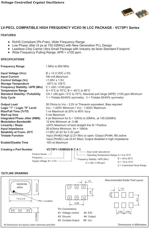 Fortiming晶振,VC75P1晶振,VC75P1-26M520-BCA1晶振,壓控晶振(VCXO),壓控石英晶體振蕩器基本解決方案,PECL輸出,輸出頻率60MHz到200MHz之間,出色的低相位噪聲和抖動,三態(tài)功能,應用:SDH/SONET,以太網,基站,筆記本晶振應用,符合RoHS/無鉛.