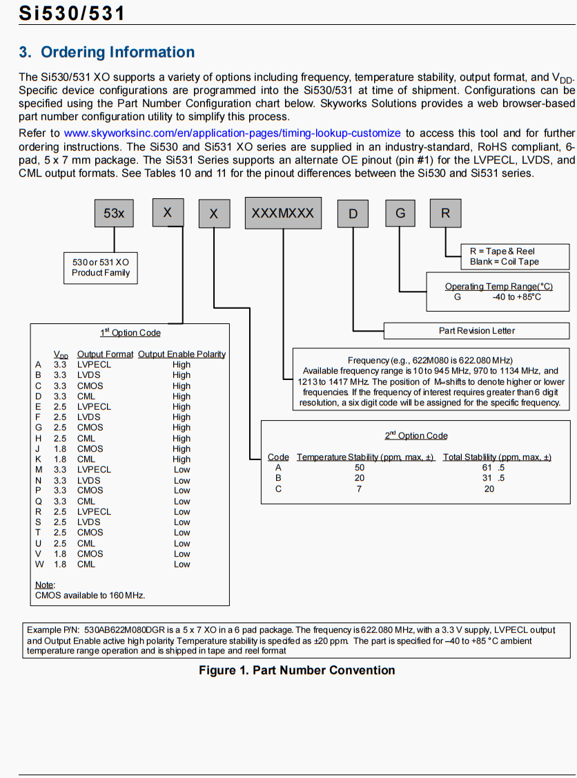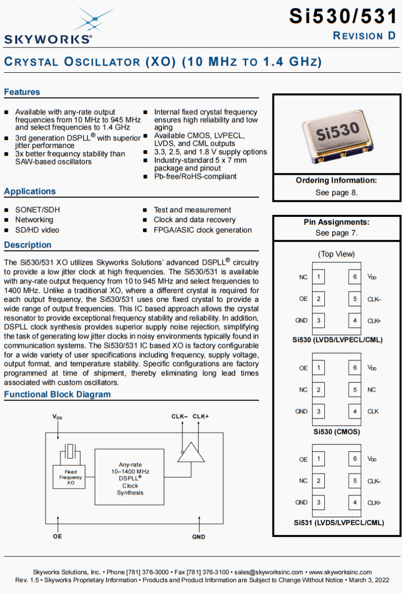 | 530AA156M250DG | Skyworks晶振 | Si530 | 156.25 MHz | LVPECL | 3.3V | ±50ppm |