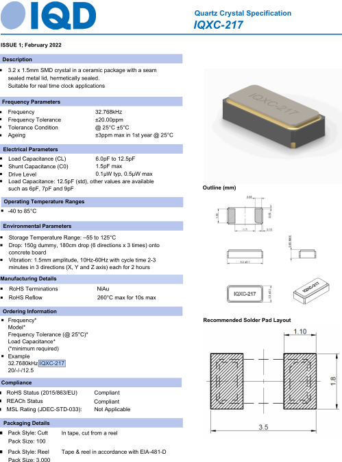 IQD伊克德晶振在1988年獲得證書到BS 5750,所有IQD石英晶振,石英晶體諧振器,壓電水晶的設(shè)計、制造和測試設(shè)備都被認證為ISO 9001:2008.我們的質(zhì)量管理體系不斷完善和適應(yīng)各個領(lǐng)域的使用,以滿足國際標(biāo)準和客戶的需求.伊克德晶振,IQXC-217晶振,32.7680kHz-IQXC-217-20/12.5晶振.