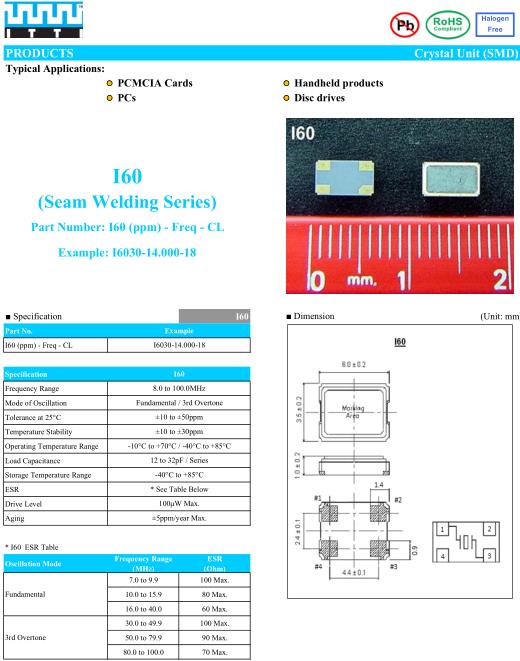 ITTI晶振,I60晶振,I6030-14.000-18晶振,貼片晶振本身體積小,超薄型石英晶體振蕩器,特別適用于有目前高速發展的高端電子數碼產品,因為晶振本身小型化需求的市場領域,小型,薄型是對應陶瓷振蕩器(偏差大)和普通的石英晶體振蕩器(偏差小)的中間領域的一種性價比較出色的產品.產品廣泛用于筆記本電腦,無線電話,衛星導航SSD,USB,Blu-ray等用途,符合無鉛焊接的高溫回流焊曲線特性.TTI抱著簡單而創新的宗旨,為各客戶提供優質,經濟的石英電子,更希望成為各位客戶之長遠合作伙伴; 擁有全面,先進之石英晶體,包括, 晶體濾波器(Crystal Filter)、陶瓷諧振器(Ceramic Resonator) 與及其他最先進之晶體振蕩器(Crystal Oscillator)…。等產品。我們擁有可媲美世界一級水平之能力及資源。