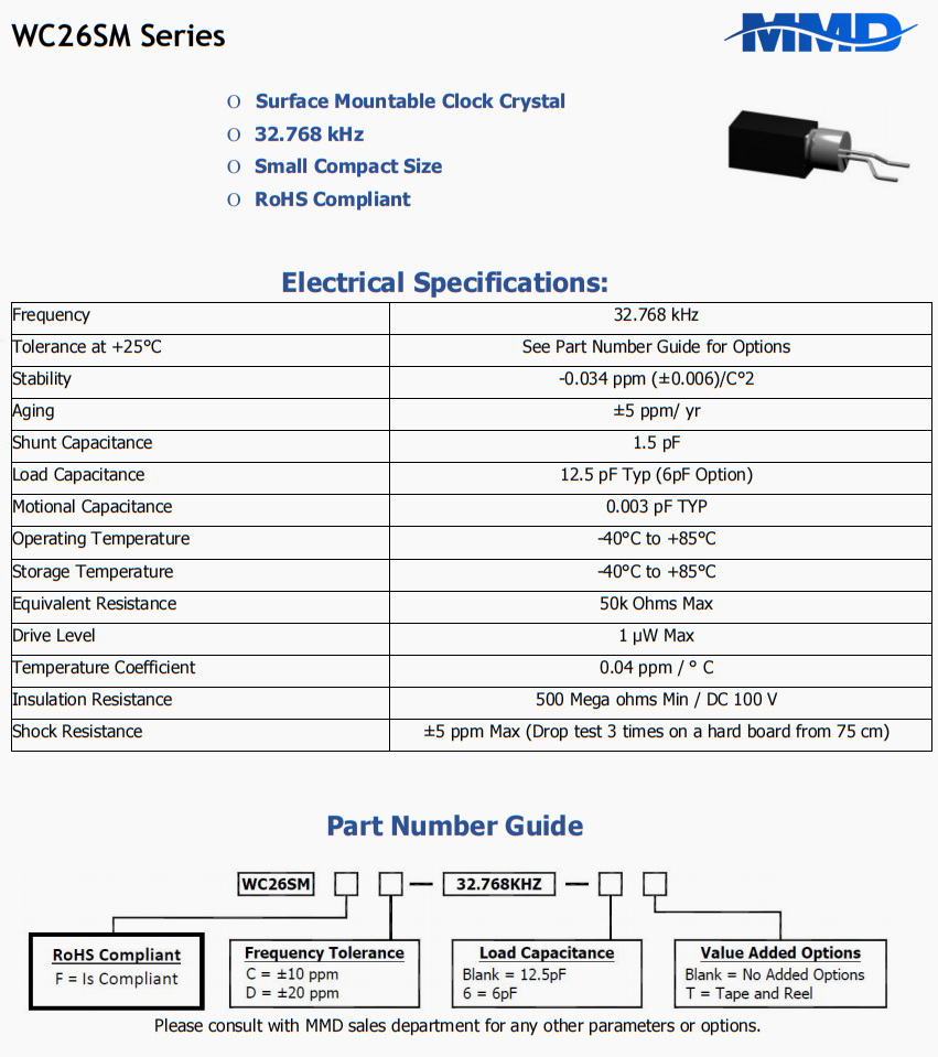 | WC26SMFC-32.768KHZ-T | MMD | WC26SM | 32.768 kHz | ±10ppm | 12.5 pF | |