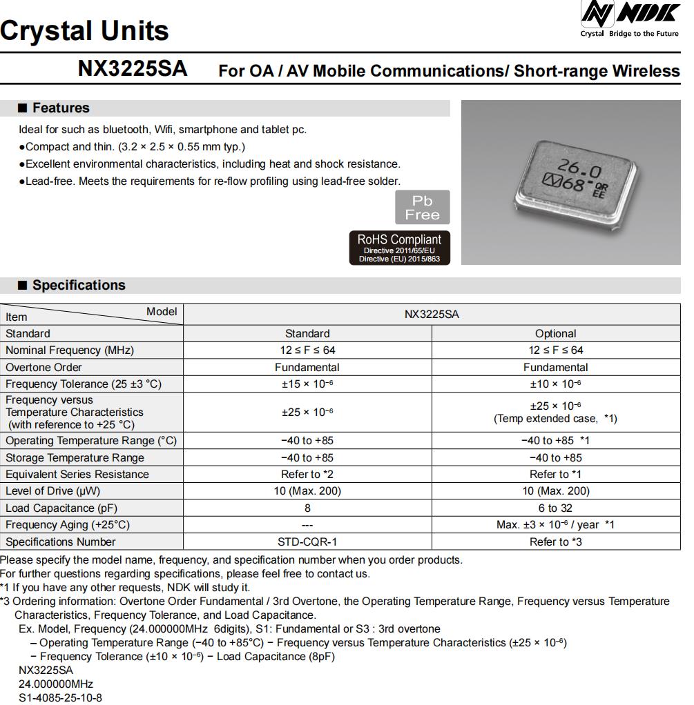 NX3225SA-32.000MHZ-STD-CSR-1\32MHZ\15ppm\NDK,型號NX3225SA,尺寸為3225mm,頻率為32MHZ,頻率穩(wěn)定度15ppm,NDK晶振,3225mm貼片晶振,SMD晶振,石英晶體,無源晶振,石英晶體諧振器,水晶振動子,藍(lán)牙晶振,輕薄型晶振,智能手機(jī)晶振,平板電腦晶振,NX3225SA-24.576MHZ-STD-CSR-1晶振,NX3225SA-25.000M-STD-CSR-3晶振。產(chǎn)品主要被廣泛應(yīng)用于電子設(shè)備,網(wǎng)絡(luò)產(chǎn)品,最適用于藍(lán)牙、Wifi、智能手機(jī)、平板電腦等產(chǎn)品。