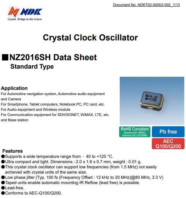 NZ2016SH-24.000MHZNSC5022C貼片振蕩器,NDK車載有源晶振NZ2016SH,是一款高質量低電壓的SPXO振蕩器,特征 :支持–40至+125°c的寬溫度范圍 ,超緊湊和輕便。尺寸:2.0 x 1.6 x 0.7毫米,重量:0.01克 ,這種晶體時鐘振蕩器不容易支持低頻(從1.5MHz開始) 用相同尺寸的晶體單元實現。 低相位抖動(典型值。100fs(頻率偏移:12kHz至20MHz)(80MHz,3.3V) ,膠帶裝置可實現自動安裝,IR回流(無鉛)是可能的。 無鉛。 符合AEC-Q100/Q200。產品用于汽車導航系統、汽車音響設備和照相機 用于智能手機、平板電腦、筆記本電腦、PC卡等。 用于音頻設備和無線模塊,適用于SDH/SONET、WiMAX、LTE等通信設備,基站.NZ2016SH-24.000MHZNSC5022C貼片振蕩器,NDK車載有源晶振NZ2016SH.
