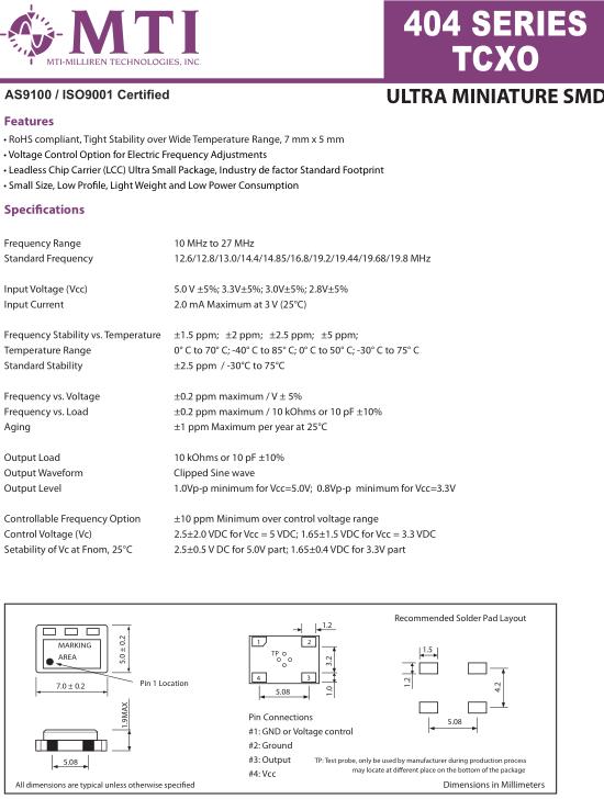 MTI晶振,404晶振,TCXO振蕩器,溫補(bǔ)晶振(TCXO)產(chǎn)品本身具有溫度補(bǔ)償作用,高低溫度穩(wěn)定性:頻率精度高0.5PPM-2.0PPM,工作溫度范圍:-30度至85度,電源電壓:1.8V~3.3V之間可供選擇,產(chǎn)品本身具有溫度電壓控制功能,世界上最薄的晶振封裝,頻率:26兆赫,33.6兆赫,38.4兆赫,40兆赫,因產(chǎn)品性能穩(wěn)定,精度高等優(yōu)勢,被廣泛應(yīng)用到一些比較高端的數(shù)碼通訊產(chǎn)品領(lǐng)域,GPS全球定位系統(tǒng),智能手機(jī),WiMAX和蜂窩和無線通信等產(chǎn)品,符合RoHS/無鉛.