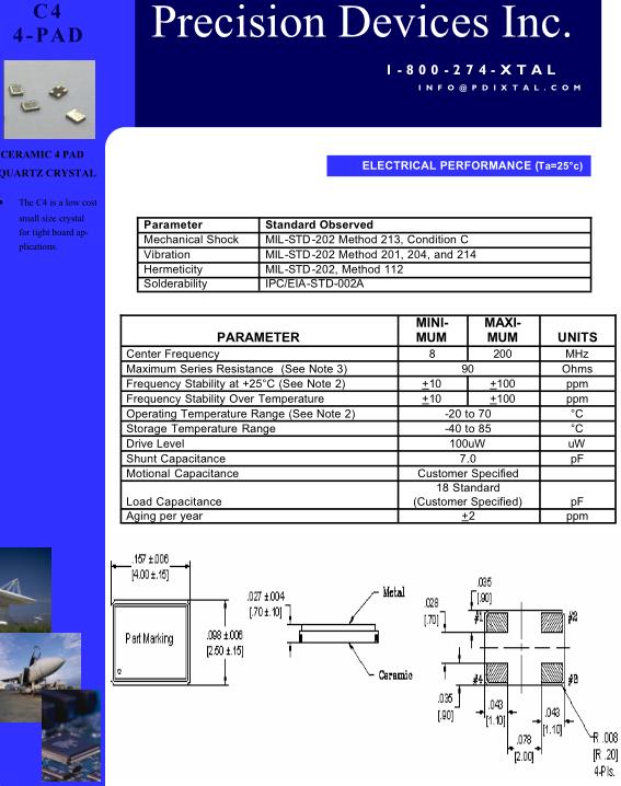 PDI晶振,C4晶振,無源四腳晶振,貼片晶振本身體積小,超薄型石英晶體振蕩器,特別適用于有目前高速發展的高端電子數碼產品,因為晶振本身小型化需求的市場領域,小型,薄型是對應陶瓷振蕩器(偏差大)和普通的石英晶體振蕩器(偏差小)的中間領域的一種性價比較出色的產品.產品廣泛用于筆記本電腦,無線電話,衛星導航SSD,USB,Blu-ray等用途,符合無鉛焊接的高溫回流焊曲線特性.美國PDI 頻率控制元器件, 主要致力于石英晶振, 濾波器等系列產品規格的銷售。頻率控制產品:Crystals 石英晶體, Filter 晶體濾波器, XO 晶體振蕩器, VCXO壓控晶振, TCXO 溫補晶振, OCXO 恒溫晶振, TC-OCXO 溫補恒溫晶振, XO SMD封裝系列, XO 引線式封裝系列, TCXO SMD封裝系列, TCXO 引線式封裝系列, OCXO 恒溫晶振, OCXO SMD 封裝系列, OCXO 引線式封裝系列, TCVCXO 溫補壓控晶振.