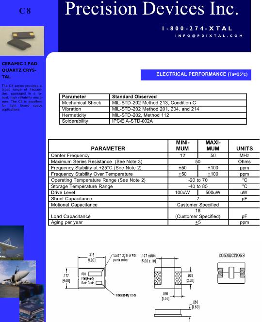 PDI晶振,C8晶振,PDI諧振器,貼片晶振本身體積小,超薄型石英晶體振蕩器,特別適用于有目前高速發展的高端電子數碼產品,因為晶振本身小型化需求的市場領域,小型,薄型是對應陶瓷振蕩器(偏差大)和普通的石英晶體振蕩器(偏差小)的中間領域的一種性價比較出色的產品.產品廣泛用于筆記本電腦,無線電話,衛星導航SSD,USB,Blu-ray等用途,符合無鉛焊接的高溫回流焊曲線特性.美國PDI 頻率控制元器件, 主要致力于石英晶振, 濾波器等系列產品規格的銷售。頻率控制產品:Crystals 石英晶體, Filter 晶體濾波器, XO 晶體振蕩器, VCXO壓控晶振, TCXO 溫補晶振, OCXO 恒溫晶振, TC-OCXO 溫補恒溫晶振, XO SMD封裝系列, XO 引線式封裝系列, TCXO SMD封裝系列, TCXO 引線式封裝系列, OCXO 恒溫晶振, OCXO SMD 封裝系列, OCXO 引線式封裝系列, TCVCXO 溫補壓控晶振.