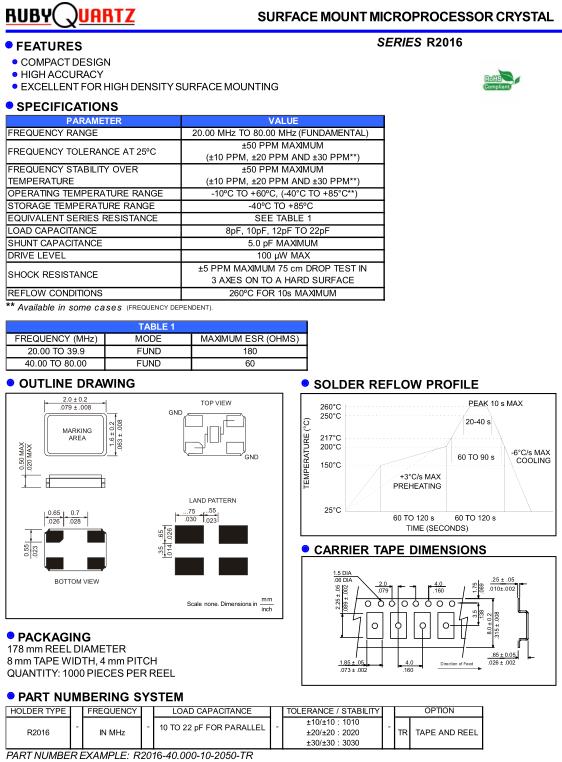 Rubyquartz晶振,R2016晶振,R2016-40.000-10-2050-TR晶振