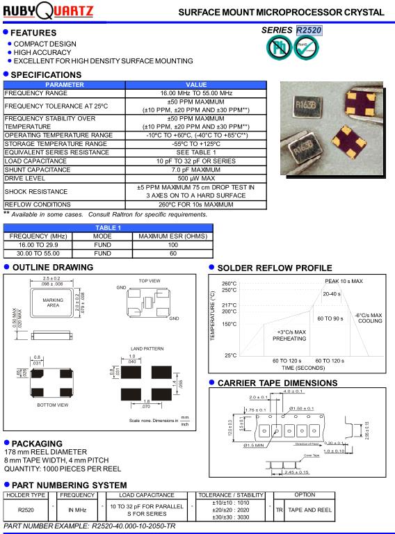 Rubyquartz晶振,R2520晶振,R2520-40.000-10-2050-TR晶振