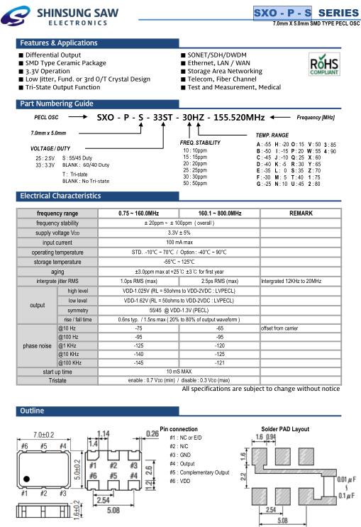 SHINSUNG晶振,SXO-P-S晶振,SXO-P-S-33ST-30HZ-26MHz晶振,小型SMD有源晶振,從最初超大體積到現在的7050mm,6035mm,5032mm,3225mm,2520mm體積,有著翻天覆地的改變,體積的變小也使產品帶來了更高的穩定性能,接縫密封石英晶體振蕩器,精度高,覆蓋頻率范圍寬的特點,SMD高速自動安裝和高溫回流焊設計,Optionable待機輸出三態輸出功能,電源電壓范圍:1.8V~5V,高穩定性,低抖動,低功耗,主要應用領域:無線通訊,高端智能手機,平板筆記本WLAN,藍牙,數碼相機,DSL和其他IT產品的晶振應用,三態功能,PC和LCDM等高端數碼領域,符合RoHS/無鉛.