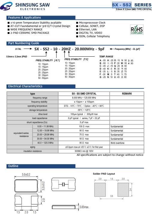 SHINSUNG晶振,SX-SS2晶振,SX-SS2-10-20HZ-20.000MHz-9pF晶振,貼片石英晶體,體積小,焊接可采用自動貼片系統,產品本身小型,表面貼片晶振,特別適用于有小型化要求的電子數碼產品市場領域,因產品小型,薄型優勢,耐環境特性,包括耐高溫,耐沖擊性等,在移動通信領域得到了廣泛的應用,晶振產品本身可發揮優良的電氣特性,滿足無鉛焊接的高溫回流溫度曲線要求.SHINSUNG晶振公司的發展如下: