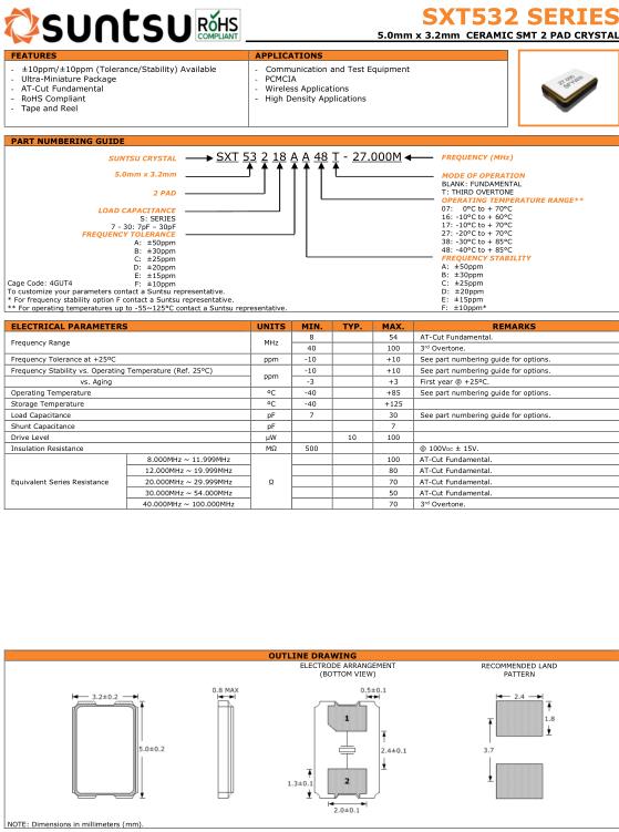 | Suntsu晶振規格 | 單位 | SXT532晶振頻率范圍 | 石英晶振基本條件 |