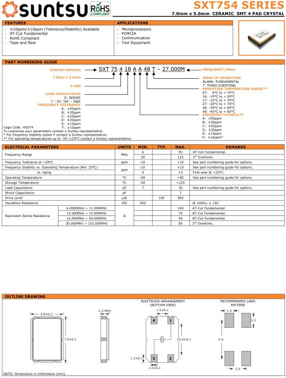 | Suntsu晶振規(guī)格 | 單位 | SXT754晶振頻率范圍 | 石英晶振基本條件 | |
