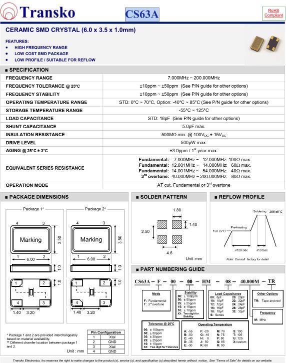 | SPECIFICATION-Transko晶振 | CS63A晶振 |