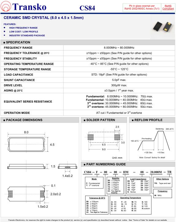 | SPECIFICATION-Transko晶振 | CS84晶振 |