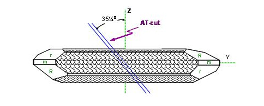 在各種不同種類的切割角度方式中, AT角度切割的石英芯片適用在數MHz到數佰MHz的頻率范圍,是石英芯片應用范圍最廣范及使用數量最多的一種切割應用方式. 在(圖一)中, 從石英晶棒X-軸向的上視圖, 可以看到對Z-軸向旋轉約35度的AT 方向. 這在大量生產的技術上也是很好達成的一種作業方式.