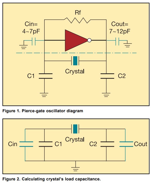 Example: Let Cin = Cout = 5pF; C1 = C2 = 20pF Therefore, Cload = {[25][25]/[25+25]} + 3 = 12.5 + 3 = 15.5pF